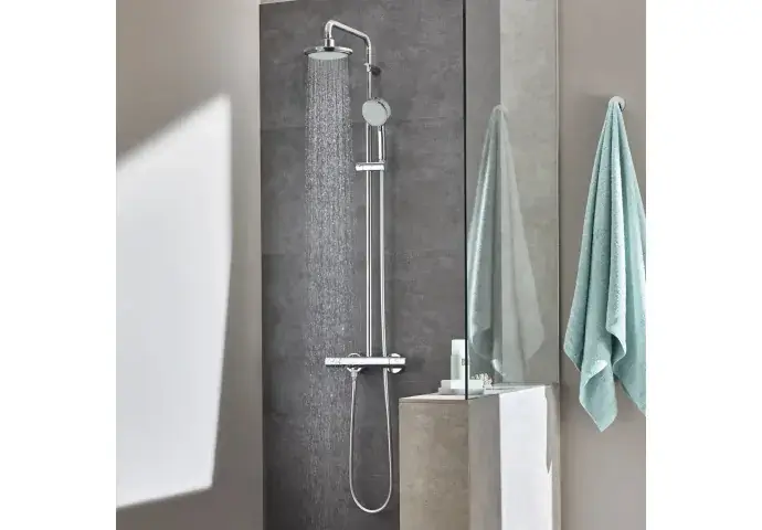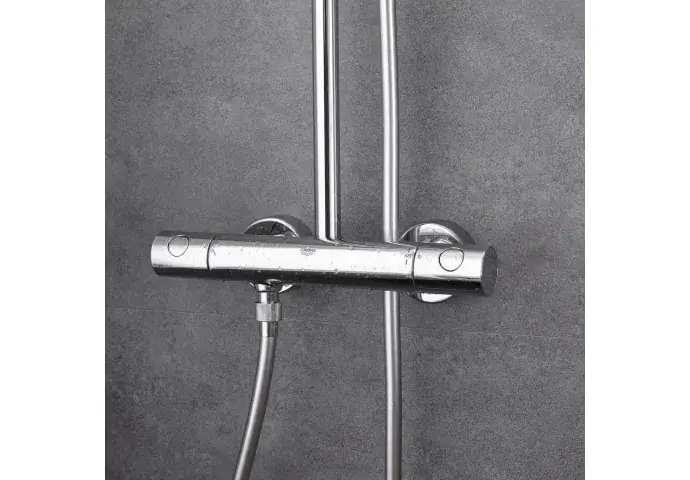 Deze GROHE Tempesta New Cosmopolitan doucheset combineert comfort, veiligheid en een tijdloos design. Dankzij de thermostaatkraan en de regendouche geniet u elke dag van een ontspannen en betrouwbare douche-ervaring.